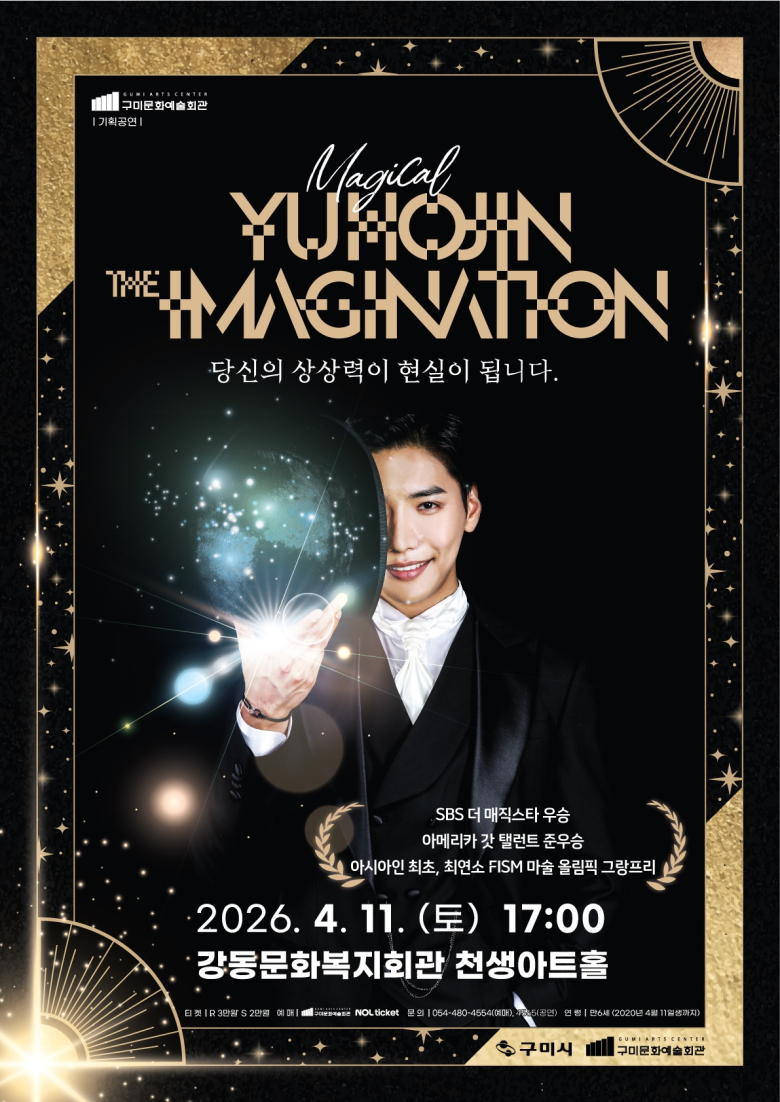 구미시는 오는 11일 오후 5시 강동문화복지회관 천생아트홀에서 살아있는 전설의 마술사 유호진의 단독 공연 '더 이미지네이션'(The Imagination)을 개최한다.마술사 유호진은 수식어가 필요 없는 세계 최정상급 아티스트다. 지난 2012년 영국 블랙풀에서 열린 세계마술올림픽(FISM)에서 64년 역사상 최연소이자 아시아인 최초로 스테이지 부문 종합 우승(Grand Prix)을 차지하며 혜성처럼 등장했다.이후 한국인 최초 브로드웨이 쇼 일루셔니스트 멤버 발탁, 2022년 미국 NBC '아메리카 갓 탤런트' 준우승을 통해 글로벌 스타로서 입지를 굳혔다.최근에는 국내 최초 글로벌 마술 오디션인 SBS '더 매직스타'에서 최종 우승을 거머쥐며 명실상부 대한민국 최고의 마술사임을 다시 한번 입증했다.이번 공연 '더 이미지네이션'에서는 유호진 마술사의 영혼이 담긴 대표작 '카드 매니퓰레이션'을 직접 확인할 수 있다. 화려한 기계 장치 없이 오직 서정적인 음악과 섬세한 손기술만으로 관객의 눈과 마음을 사로잡는 이 무대는 단 8분을 완성하기 위해 10년의 세월을 연마해 온 그의 예술적 집념이 고스란히 녹아있다.구미시는 더 많은 시민이 세계 수준의 공연을 향유할 수 있도록 파격적인 할인 혜택을 제공한다. ▲구미 시민과 기업체 직원 30% ▲다자녀 가정과 병역명문가 40% ▲전입 1년 이내 구미 시민 50%의 할인 혜택이 주어진다.구미시문화예술회관 관계자는 "유호진은 TV 화면으로는 결코 다 담아낼 수 없는 정교하고 섬세한 예술 세계를 가진 아티스트"라며 "세계 정상급 마술사가 선사하는 경이로운 상상의 무대를 현장에서 직접 경험하며 깊은 전율과 감동을 느끼길 바란다"고 전했다.