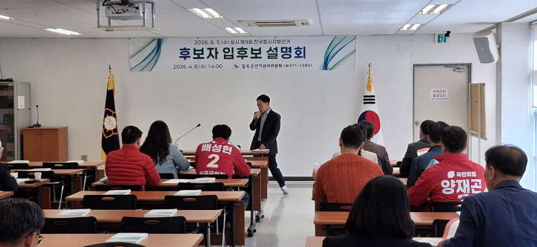 칠곡군 선관위는 지난 8일 선관위 2층 교육실에 칠곡군 예비등록후보 설명회를 개최했다.이날 후보교육은 칠곡군수 예비후보 3명 및 군의원 예비후보 16명 등 총 19명이 참석해 예비후보자 등록과 선거운동법 위한 예방 단속 등 후보자가 알아야 할 핵심 사무를 안내하는 교육이다.이번 예비등록후보자 설명회 참석대상은 입후보예정자, 선거사무장 및 회계책임자 선임예정자, 정당 관계자 등 기타 참석 희망자들이 설명회에 참석할 수 있다.주요 교육 내용은 예비등록후보자는 선거운동(제한 금지 포함) 정치자금 및 회계보고, 선거법 위반행위 일체 예방단속, 기타 후보자 관련 안내 등으로 이번 6·3지방선거가 보다 깨끗한 선거 문화가 정착되는 후보자 설명회를 가졌다.