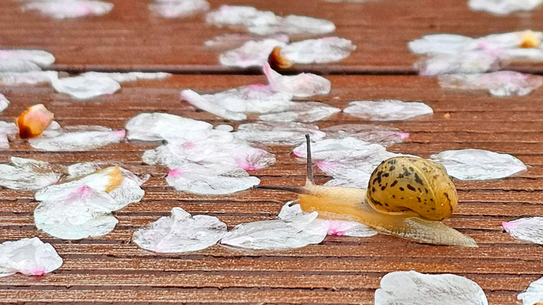 전국 곳곳에 봄비가 내리는 10일 강원 춘천시 공지천 벚꽃길 데크 위로 달팽이가 기어가고 있다. 연합
