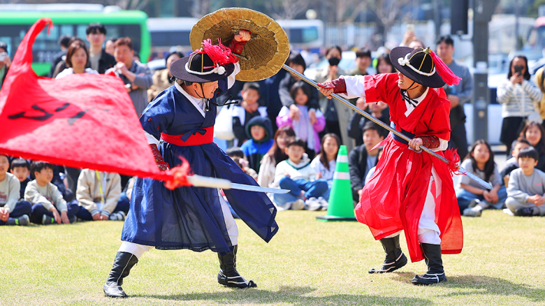 11일 서울 종로구 의정부지 역사유적광장을 찾은 시민들이 조선시대 군사의례 '열무' 시연을 보고 있다. 연합