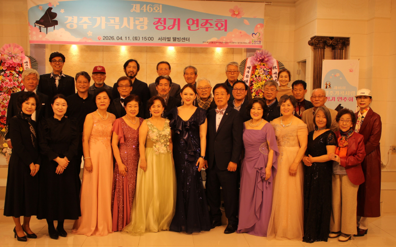 제46회 경주가곡사랑 정기연주회가 지난 11일 서라벌 웰빙센터에서 열렸다. 이번 공연은 한수원(주) 월성원자력본부의 지원으로 마련됐으며 현곡노인회장들과 경주 시민을 대상으로 위로의 무대로 꾸며졌다.배단영의 사회와 장지영의 반주로 진행된 이날 연주회는 수필가 배단영의 시낭송 ‘세시에서 다섯시 사이’로 문을 열며 서정적인 분위기를 자아냈다. 특히 초청 성악가인 소프라노 서아름이 ‘내 맘의 강물’ 등을 들려주며 한층 깊어진 감성의 무대를 선사했다.