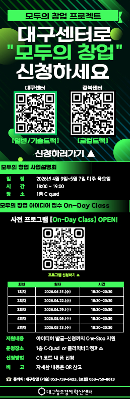 대구창조경제혁신센터와 경북창조경제혁신센터가 지역 자원을 활용한 로컬 창업가 발굴에 나선다.대구센터는 경북센터와 함께 ‘모두의 창업 프로젝트-로컬트랙’ 대경권 운영기관으로 참여해 예비창업자를 오는 5월 15일까지 모집한다고 밝혔다.이번 사업은 중소벤처기업부가 총괄하고 소상공인시장진흥공단이 전담하는 창업 지원 프로그램으로, 아이디어만 있으면 누구나 참여할 수 있는 오디션 방식으로 운영된다.참가 신청은 ‘모두의 창업 플랫폼’을 통해 온라인으로 접수하며, 로컬트랙은 전국 단위로 1000명을 선발할 예정이다. 이 중 비수도권 비중을 90%로 확대해 지역 창업을 집중 지원한다.선발된 창업자에게는 초기 창업활동자금 200만 원과 함께 멘토링, 교육 등이 제공되며 단계별 평가를 거쳐 최대 3000만 원의 사업화 자금이 지원된다. 최종 우승자에게는 최대 1억 원의 상금과 투자 연계 등 후속 지원도 이어진다.한인국 대구센터 대표는 “지역 자산과 혁신이 결합한 로컬 창업이 지역경제 활성화의 핵심”이라며 “창업가들이 경쟁력 있는 기업으로 성장할 수 있도록 적극 지원하겠다”고 말했다.