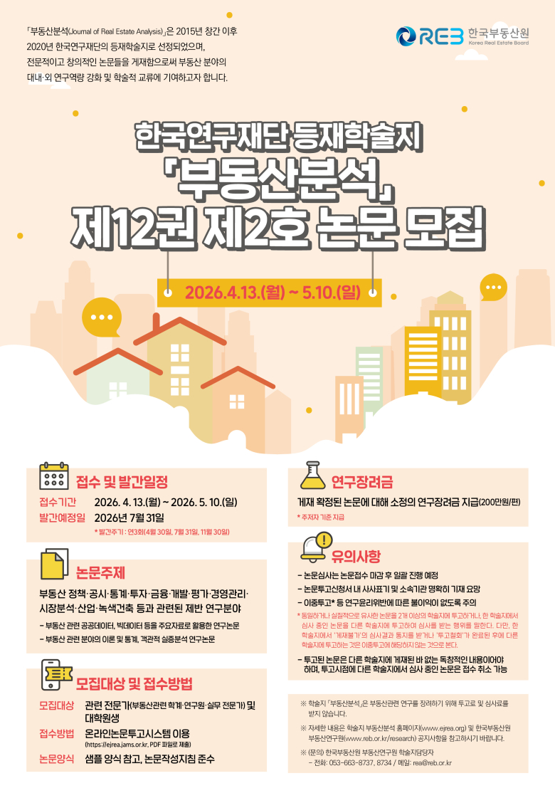 한국부동산원이 부동산 분야 연구 활성화를 위해 등재학술지 ‘부동산분석’에 수록할 논문을 모집한다.한국부동산원은 ‘부동산분석’ 제12권 제2호(7월 31일 발간 예정)에 게재할 논문을 오는 5월 10일까지 접수한다고 밝혔다.공모 주제는 부동산 정책, 공시, 통계, 투자, 금융, 개발, 평가, 경영관리, 시장분석, 산업, 녹색건축 등으로, 관련 분야 전문가와 대학원생이면 누구나 참여할 수 있다.논문은 온라인 논문투고시스템을 통해 접수하며, 세부 사항은 ‘부동산분석’ 및 한국부동산원 부동산연구원 누리집 공지사항에서 확인 가능하다.김근용 부동산원 연구원장은 “다양한 연구자들의 참여를 통해 부동산 시장에 대한 심도 있는 논의가 확산되길 기대한다”며 “학술지 발전과 연구 생태계 활성화를 위해 지속 노력하겠다”고 말했다.