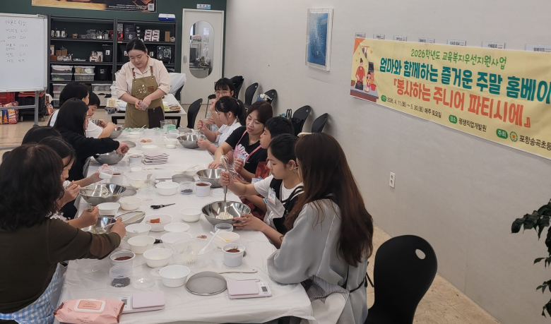 포항송곡초등학교가 학생과 학부모가 함께 참여하는 체험형 교육 프로그램을 통해 배움과 나눔을 동시에 실천한다.포항송곡초등학교는 4월 11일부터 5월 30일까지 ‘봉사하는 주니어 파티시에’ 프로그램을 운영한다고 13일 밝혔다.이번 프로그램은 교육복지우선지원사업의 일환으로 마련됐으며, 총 7개 가족팀이 참여해 매주 토요일 제과·제빵 기술을 배우고 직접 만든 간식을 지역사회에 기부하는 활동으로 진행된다.특히 전문 교육기관인 평생직업개발원 포항지부와 연계해 체계적인 교육이 이뤄지며, 학생들은 홈베이킹 자격증 취득에도 도전하게 된다.학생들은 부모와 함께 빵을 만들며 자연스럽게 소통하고 협력하는 과정을 통해 자기효능감과 정서적 유대감을 높일 수 있을 것으로 기대된다.오는 5월에는 참여 가족들이 만든 빵과 과자를 지역 요양원에 전달하고 응원 메시지 카드를 함께 전하는 나눔 활동도 진행될 예정이다.학교 측은 이번 프로그램이 학생들이 단순한 수혜자가 아닌 나눔의 주체로 성장하는 계기가 될 것으로 보고 있다.백운호 교장은 “부모와 자녀가 함께하는 경험을 통해 서로를 이해하고, 나눔의 가치를 배우는 뜻깊은 시간이 되길 바란다”고 말했다.