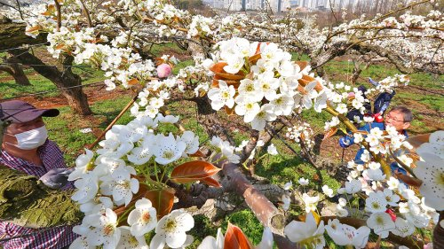 13일 인천 남동구 수산동 한 과수원에서 농부들이 배꽃 만개한 시기를 맞아 인공수분 작업을 하고 있다. 연합