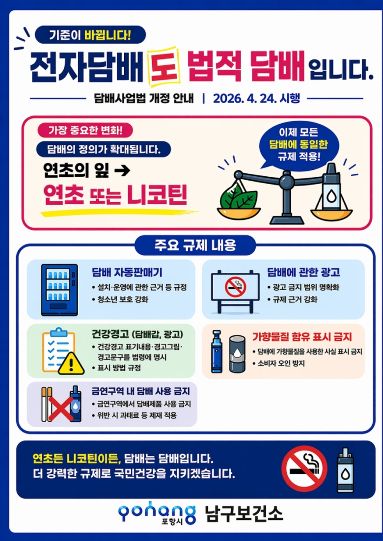 포항시가 액상형 전자담배를 포함한 모든 담배 제품에 대한 금연구역 규제를 강화한다.포항시는 개정된 담배사업법 시행에 따라 액상형 전자담배가 공식 규제 대상에 포함됐다고 14일 밝혔다. 기존에는 ‘연초의 잎’을 원료로 한 제품만 담배로 규정됐지만, 앞으로는 ‘연초 또는 니코틴’을 원료로 제조된 제품까지 범위가 확대된다.이에 따라 오는 24일부터는 금연구역에서 궐련은 물론 궐련형·액상형 전자담배 등 모든 종류의 담배 사용이 전면 금지된다. 이를 위반할 경우 국민건강증진법과 관련 조례에 따라 과태료가 부과된다.시는 제도 시행 초기 혼란을 줄이기 위해 24일부터 다음 달 15일까지 3주간 집중 홍보와 단속을 병행할 계획이다. 이 기간 동안 금연구역 내 전자담배 사용 여부에 대한 점검을 강화한다.포항시 남구보건소와 포항시 북구보건소는 시민들이 개정 내용을 쉽게 이해할 수 있도록 안내와 계도 활동도 함께 추진할 방침이다.보건소 관계자는 “액상형 전자담배 역시 금연구역에서 사용할 수 없는 담배 제품에 해당된다”며 “시민들이 개정된 제도를 숙지하고 자발적으로 준수해 주길 바란다”고 말했다.