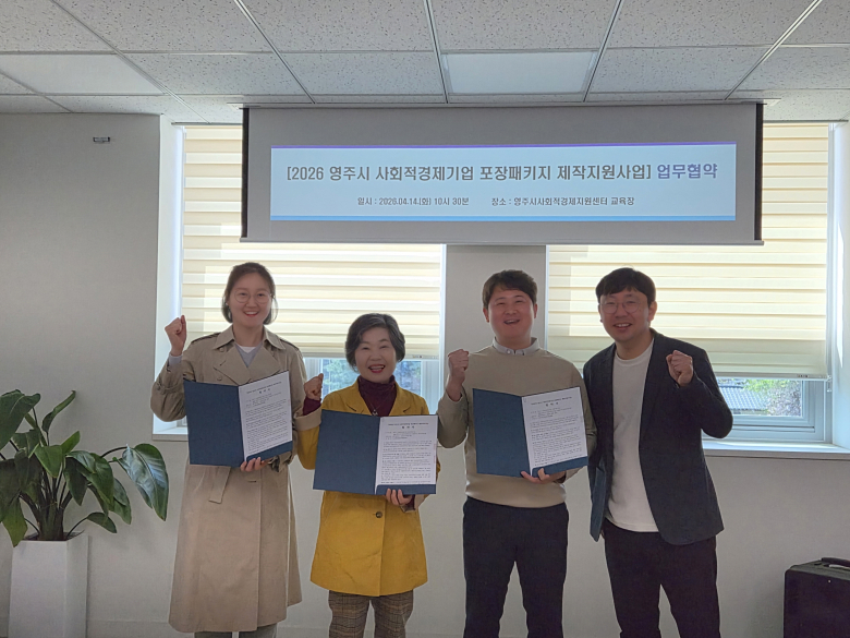영주시는 지난 14일 ‘2026년 사회적경제기업 제품패키지 지원사업’ 추진을 위해 지역 기업 및 유관기관과 업무협약을 체결했다.이날 협약식에는 ▲농업회사법인 승혜축산유통 주식회사(대표 김은주) ▲농업회사법인 주식회사 올곧이(대표 김민정) ▲녹색농심인삼마을 영농조합법인(대표 임율) ▲영주시사회적경제지원센터(센터장 한대규)가 참여했다.이번 협약은 사회적경제기업 제품의 포장패키지 개선을 통해 상품성을 높이고 시장경쟁력 확보와 자생력 강화를 지원하기 위해 추진됐다.리뉴얼 대상 제품으로는 ▲승혜축산유통의 ‘무항생제 한돈세트’ ▲올곧이의 ‘풍기애삼 사과홍삼차’ ▲녹색농심인삼마을의 ‘떡국떡’이 선정됐다.선정 기업에는 총 1500만 원 규모의 성장지원금이 지원되며, 제품 상세페이지 제작과 품평회 개최 등을 통해 리뉴얼 제품의 온·오프라인 판매 확대도 함께 추진할 예정이다.정교완 일자리경제과장은 “사회적경제기업이 가진 다양한 사회적 가치가 시장에서도 경쟁력으로 이어질 수 있도록 지원을 강화하겠다”며 “앞으로도 판로 확대와 브랜드 경쟁력 제고를 위한 맞춤형 지원을 지속해 나가겠다”고 말했다.