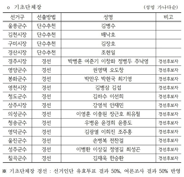이날 발표된 기초단체장 중 단수 추천은 경산시장에 조현일, 구미시장에 김장호, 김천시장에 배낙호, 울릉군수에 김병수 후보 등 전·현직 단체장들이 공천됐다.경선으로 치러지는 의성군수에 이영훈, 이충원, 장근호, 최유철 후보, 성주군수에 이병환, 이상길, 정영길, 최성곤 후보 등 각각 4명의 경선후보가 한자리를 놓고 경쟁을 벌이게 됐다. 3대 1 경쟁은 봉화군수 박만우, 박현국, 최기영 후보, 청송군수 우병윤, 윤경희, 윤종도 후보, 영덕군수 김광열, 이희진, 조주홍 후보 등이다.양자 대결은 영양군수 권영택, 오도창 후보, 영천시장 김병삼, 김섭 후보, 청도군수 김하수, 이선희 후보, 울진군수 손병복, 전찬걸 후보, 칠곡군수 김재욱, 한승환 후보 등이 포함됐다.