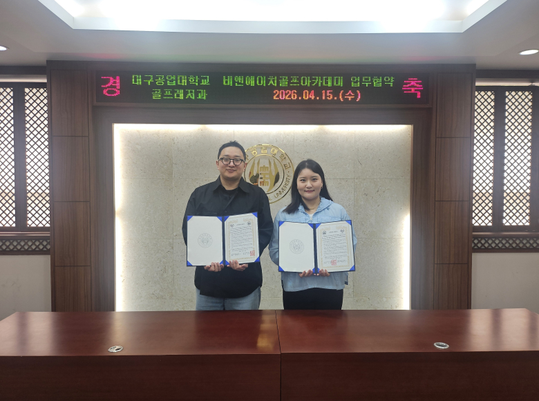 대구공업대학교 골프레저과가 골프 전문 교육기관 비앤에이치골프아카데미와 손잡고 현장 중심 교육 강화에 나섰다.대구공업대학교는 최근 비앤에이치골프아카데미와 산학협력 업무협약을 체결하고 골프 산업 실무 교육과 취·창업 연계 프로그램 확대를 위한 협력 체계를 구축했다고 밝혔다.이번 협약은 학생들이 실제 골프 산업 현장을 경험할 수 있는 교육 환경을 조성하고, 실질적인 진로 탐색과 취업 기회를 제공하기 위해 마련됐다.