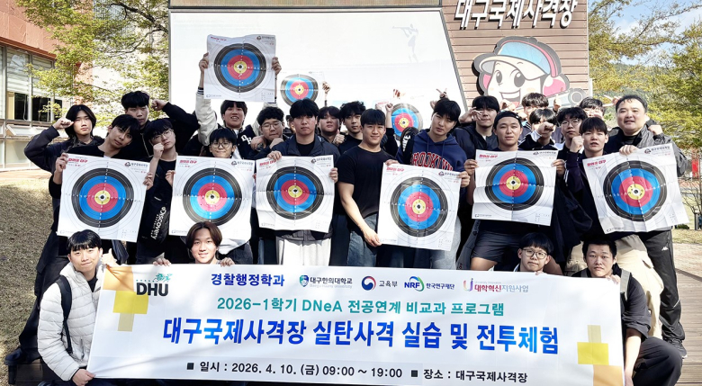 글로컬대학 대구한의대학교 경찰행정학과는 지난 10일 대구국제사격장에서 재학생을 대상으로 실탄사격 실습과 서바이벌 체험 프로그램을 운영하며 현장 중심 교육을 강화했다.이번 프로그램은 경찰 직무 수행에 필수적인 실무 역량과 위기 대응 능력을 체계적으로 향상시키기 위해 마련됐다. 이날 학생들은 사격장 안전교육을 시작으로 사격 자세, 조준, 격발 등 기본 사격술을 전문 지도자의 지도 아래 단계적으로 익힌 뒤, 실제 권총을 활용한 실탄사격을 직접 체험했다.특히 서바이벌 체험 프로그램을 병행해 팀 단위 작전 수행을 경험하며 협동심과 상황 판단 능력을 동시에 기르는 실전형 교육이 진행돼 참여 학생들의 높은 호응을 얻었다.현장을 직접 지도한 신성원 경찰행정학과 학과장은 “이번 프로그램은 학생들이 경찰 현장에서 요구되는 사격 능력과 전술적 사고를 직접 체득할 수 있도록 기획된 교육 과정”이라며 “이론과 실습을 유기적으로 연계한 교육을 통해 현장 대응 역량을 갖춘 전문 인재 양성에 지속적으로 힘쓰겠다”고 밝혔다.프로그램에 참여한 김대용 학생회장은 “강의실에서 배우던 내용을 실제 현장에서 적용해 볼 수 있어 매우 의미 있는 경험이었다”며 “특히 팀원들과 협력하며 진행한 서바이벌 체험을 통해 경찰 업무에 필요한 협동심과 판단력을 실질적으로 기를 수 있었다”고 소감을 전했다.