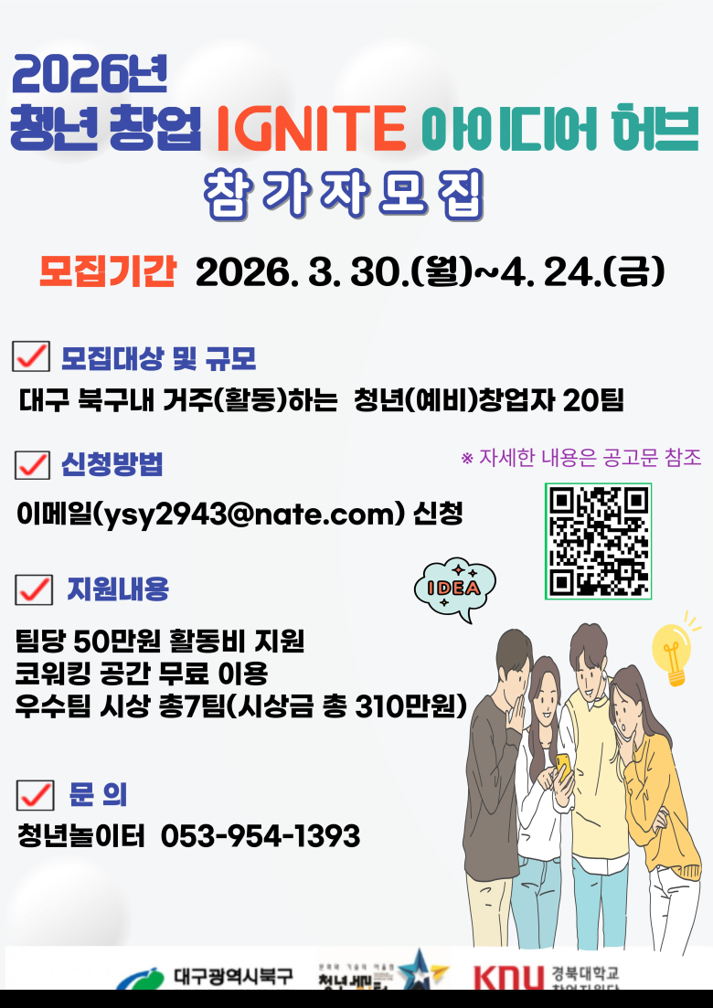 대구 북구가 청년 창업 활성화를 위해 아이디어 발굴과 사업화 지원에 나선다. 북구는 오는 24일까지 ‘청년 창업 Ignite 아이디어 허브’ 참가자 20팀을 모집한다.이번 사업은 지역 청년 예비창업자와 초기 창업자를 대상으로 창의적인 아이디어에 ‘점화(Ignite)’의 계기를 제공해 사업화 가능성을 구체화하고 실현할 수 있도록 단계별로 지원하는 프로그램이다.참가 대상은 청년놀이터 멤버십 회원 또는 창업놀이터 입주기업 가운데 만 39세 이하 북구 지역 청년 (예비)창업자로, 북구 거주자나 북구 소재 기업 재직자, 지역 대학생(휴학생), 창업 3년 미만 기업 중 하나 이상의 요건을 충족하면 신청할 수 있다.선발된 팀에는 월 2회 이상 협업 공간 이용이 지원되며 팀당 활동비 50만 원이 지급된다. 또 성과발표회를 통해 상위 7개 팀에는 총 310만 원 규모의 시상금이 주어진다.배광식 북구청장은 “청년의 아이디어가 미래를 밝히는 원동력이 될 수 있도록 지속적으로 도전 기회를 제공하겠다”며 “북구를 청년 창업 거점 지역으로 육성해 나가겠다”고 말했다.