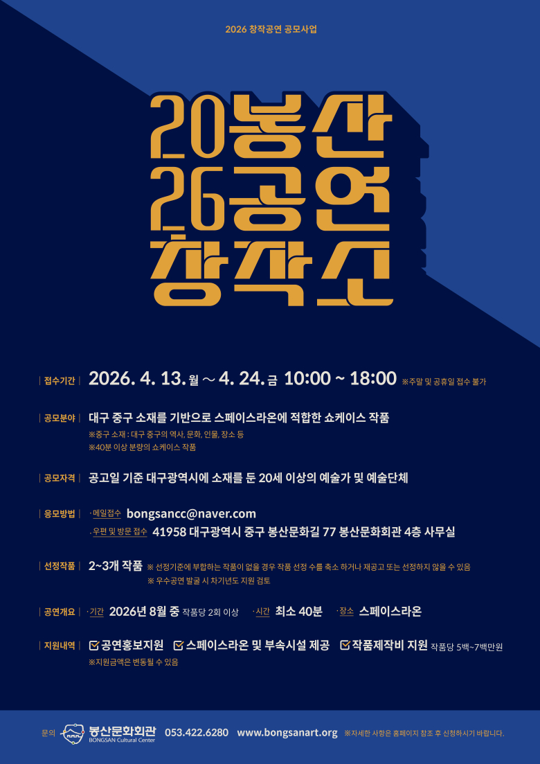 중구 도심재생문화재단 봉산문화회관이 대구 중구의 역사와 인물, 문화를 소재로 한 창작공연을 발굴하는 공모사업 '2026년 봉산공연창작소'의 참가작 모집에 나선다.