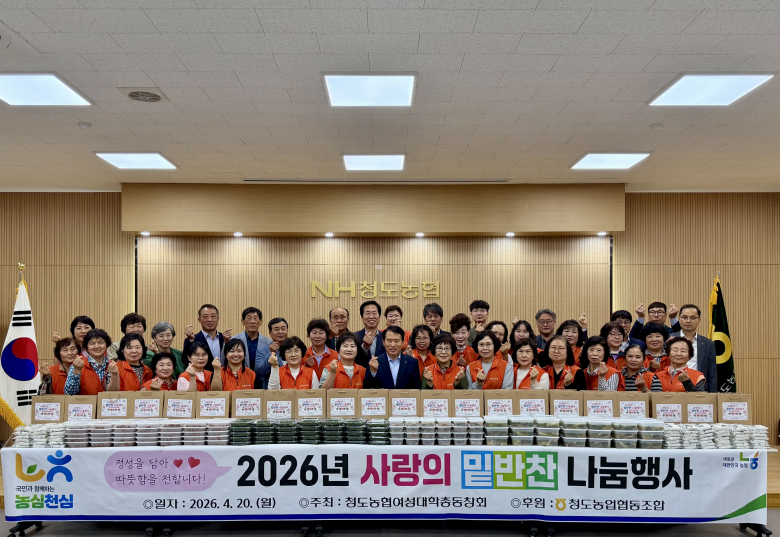 청도농협은 지난 20일 공판장 2층 대회의실에서 지역 내 취약계층을 위한 사랑의 밑반찬 나눔 행사를 실시하며 따뜻한 나눔을 실천했다. 이번 행사는 고향주부모임 회원들이 정성껏 준비한 밑반찬을 독거노인 및 소외계층 가정에 전달하기 위해 마련됐으며 바쁜 일상 속에서도 이웃을 먼저 생각하는 회원들의 자발적인 참여로 진행됐다. 청도농협 이재희 조합장은 "지역사회를 위한 따뜻한 나눔에 앞장서 주신 고향주부모임 회원 여러분께 깊이 감사드린다"며 "앞으로도 청도농협은 지역과 함께하는 다양한 사회공헌 활동을 지속적으로 펼쳐 나가겠다"고 밝혔다. 한편 청도농협은 매년 다양한 나눔 활동과 봉사활동을 통해 지역사회와 상생하는 농협으로 자리매김하고 있다.