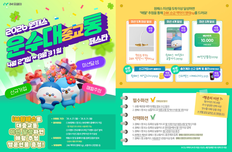 iM금융그룹 계열사 iM유페이가 27일부터 8월 31일까지 대중교통 이용 활성화를 위한 ‘2026 운수대통 페스타’ 프로모션을 진행한다.이번 행사는 고유가 상황에서 대중교통 이용을 장려하고 이용자에게 다양한 혜택을 제공하기 위해 마련됐다. ESG 경영 실천과 정부 정책 방향에 부응하는 사회적 책임 활동의 일환이다.참여자는 iM원패스 앱을 통해 대중교통과 택시 이용, 편의점 결제 등 일상 소비 활동을 하며 미션을 수행할 수 있다. 실물 교통카드로도 참여가 가능해 이용 편의성을 높였다.프로모션은 필수 미션 2종과 선택 미션으로 구성되며, 매월 달성 개수에 따라 경품 응모 기회가 확대된다. 미션 달성 수에 따라 순금 명태, 캐릭터 교통카드, 배달 상품권 등 다양한 경품이 제공된다.또 행사 기간 동안 iM원패스 앱이나 홈페이지 신규 가입자 1,200명에게 마일리지를 지급하고, 충전계좌 등록 후 일정 금액 이상 충전한 이용자에게는 커피 교환권을 제공하는 특별 이벤트도 진행된다.iM유페이는 그룹 캐릭터를 활용한 교통카드도 선보여 고객과의 접점을 확대하고 브랜드 경험을 강화할 계획이다.윤재웅 iM유페이 대표는 “대중교통 이용을 통한 사회적 가치 창출과 이용자 혜택 확대를 동시에 추진하는 행사”라며 “지속가능한 교통·결제 환경 조성에 기여하겠다”고 말했다.