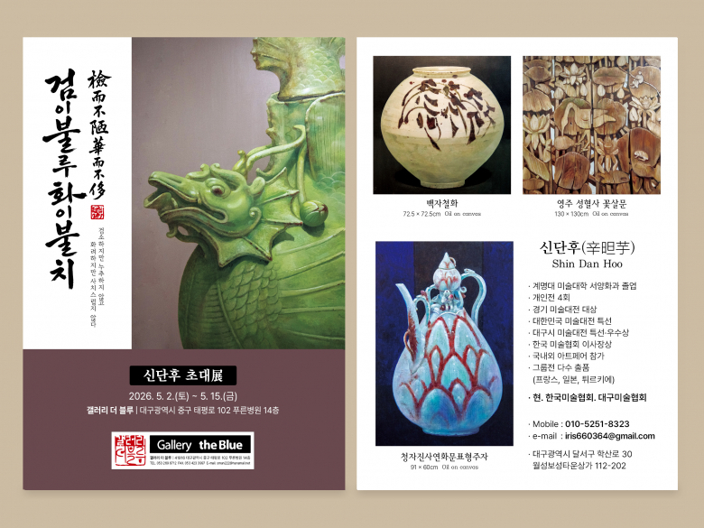 신단후 작가의 초대전이 다음달 2일부터 15일까지 대구 중구 갤러리 더 블루에서 열린다.이번 전시는 ‘검소하지만 누추하지 않고 화려하지만 사치스럽지 않다’는 의미의 ‘검이불루 화이불치(儉而不陋 華而不侈)’를 주제로, 절제된 아름다움과 균형 잡힌 한국적 미감을 회화로 풀어낸 작품들을 선보인다.전시에는 백자와 청자를 모티프로 한 정물화가 중심을 이루며 대표작 ‘백자철화’와 ‘청자진사연화문표형주자’ 등 전통 도자의 형태와 문양을 재구성한 작품들이 포함됐다. 유약의 질감과 색채를 회화적으로 표현해 도자기와 회화의 경계를 넘나드는 점이 특징이다.또 ‘영주 성혈사 꽃살문’ 등 작품에서는 목재 문양과 자연 소재를 결합해 동양적 장식성과 상징성을 강조했다. 전통 소재를 기반으로 색채와 구도를 재해석해 현대적 감각의 시각 언어로 확장한 점도 눈길을 끈다.계명대학교 미술대학 서양화과 출신인 신단후 작가는 개인전 4회를 비롯해 국내외 아트페어와 그룹전에 참여했으며, 경기미술대전 대상, 대한민국미술대전 특선, 대구시미술대전 특선·우수상 등을 수상하며 작품성을 인정받았다. 현재 한국미술협회와 대구미술협회 회원으로 활동하고 있다.갤러리 관계자는 “전통 공예의 미와 회화적 해석이 결합된 작품 세계를 한 자리에서 조망할 수 있는 전시”라며 “지역 미술 애호가들에게 새로운 감상 경험을 제공할 것”이라고 말했다.한편 이번 전시는 무료로 관람할 수 있으며, 자세한 사항은 갤러리 더 블루를 통해 확인할 수 있다.