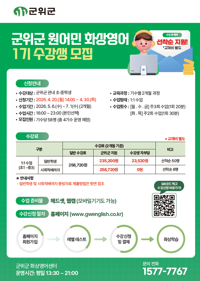 대구 군위군이 지역 초·중학생의 영어 능력 향상과 사교육비 부담 완화를 위해 ‘1대1 원어민 화상영어’ 프로그램 수강생을 오는 30일까지 선착순 모집한다.이번 프로그램은 전용 누리집을 통해 신청할 수 있으며, 원어민 강사와 실시간 화상 수업으로 학생 수준에 맞춘 맞춤형 영어 교육을 제공한다. 수업은 주 60분으로 운영되며 기존 참여자들로부터 높은 만족도를 얻고 있다.군은 2026년부터 연간 운영 기수를 기존 3기에서 4기로 확대하고, 대상도 초등학생에서 중학생까지 넓혀 더 많은 학생에게 참여 기회를 제공할 계획이다.이번 확대 운영은 학생들의 지속적인 영어 학습 환경을 조성해 교육 효과를 높이고, 사교육비 부담 감소와 지역 간 교육 격차 해소에도 도움이 될 전망이다.