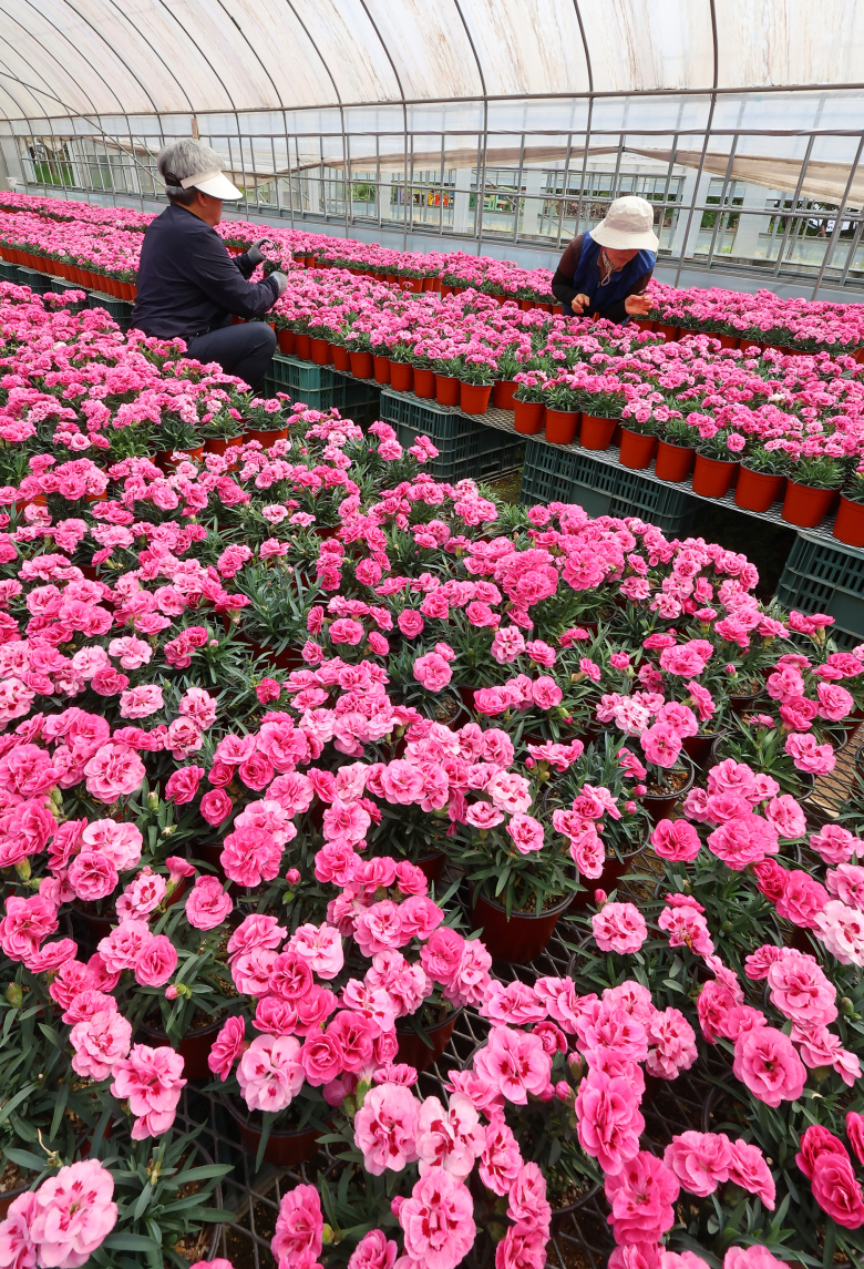 28일 인천 서구 인천환경공단 청라사업소에서 직원들이 쓰레기 소각열로 온실 재배한 카네이션을 가꾸고 있다. 이 카네이션은 5월 어버이날을 앞두고 인천적십자사, 서구청 등을 통해 복지단체와 주민들에게 무료로 기부할 예정이다. 연합