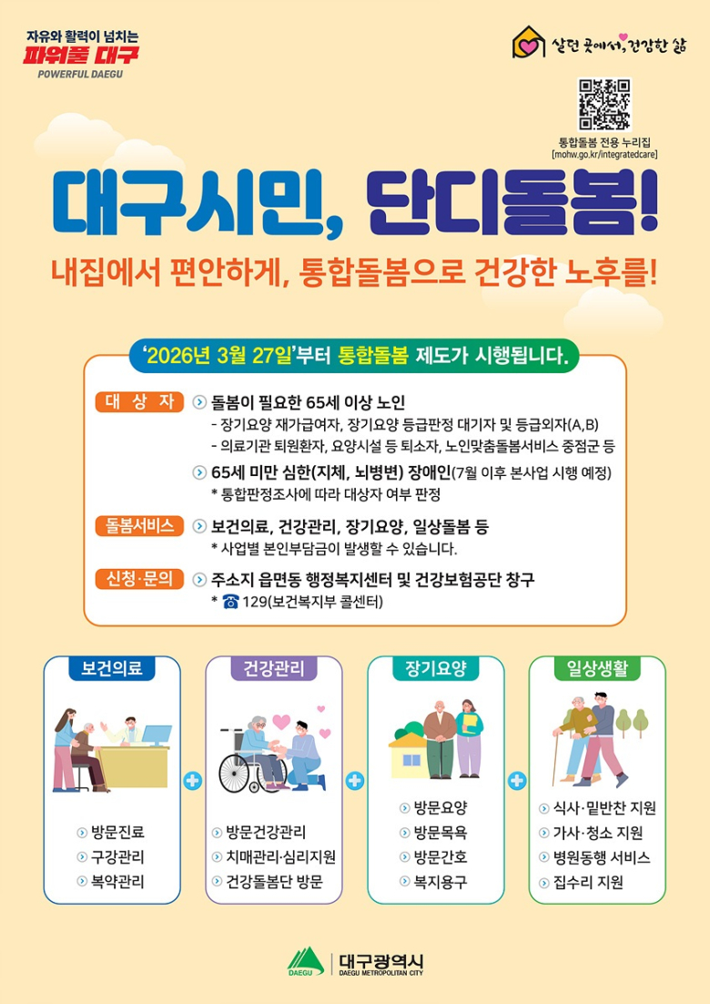 대구시는 28일 대구형 통합돌봄 ‘단디돌봄’이 시행 한 달을 맞아 신청 접수부터 서비스 연계까지 현장에 안정적으로 정착하고 있다고 밝혔다.대구시는 제도 시행에 앞서 관련 조례 제정, 전담조직 구성, 인력 확충, 민관 협력체계 구축 등 정책 기반을 선제적으로 마련했고 제도 시행 이후 읍·면·동을 중심으로 대상자 발굴과 맞춤형 서비스 제공이 원활하도록 행정력을 집중했다.제도 시행 후 지난 한 달간 총 579명이 서비스를 신청했으며, 이 중 338명에게 750건의 맞춤형 서비스가 연계돼 대상자 1인당 평균 2건 이상의 서비스가 제공된 것으로 분석됐다.서비스 영역은 일상생활 돌봄이 40%로 가장 높은 비중을 차지했고 이어 보건의료·건강관리(36%), 주거복지 및 기타 서비스(16%), 장기요양(8%) 순이다.북구에 혼자 거주하는 75세 김 모 어르신은 지난해 고관절 골절 수술 후 약 4개월간 입원 치료를 받다가 최근 퇴원했고 구청은 병원과 연계해 돌봄서비스를 사전에 준비한 후 퇴원과 동시에 가사·청소, 식사 지원, 병원 동행 등 필요한 서비스를 즉시 연계했다. 통합돌봄은 소득이나 재산 수준과 관계없이 돌봄이 필요한 시민이면 누구나 신청할 수 있다. 가족이 있는 경우라도 방문조사를 거쳐 필요성이 인정되면 지원 대상이 된다. 신청 및 상담은 주소지 관할 읍·면·동 행정복지센터 또는 국민건강보험공단 지사에서 가능하다.이재홍 대구시 보건복지국장은 “시행 한 달 만에 신청과 서비스 연계가 빠르게 확대되고 있으며 시민들이 돌봄의 변화를 체감하고 있다”며 “돌봄이 필요한 시민이 살던 곳에서 건강하게 생활할 수 있도록 보다 촘촘한 통합돌봄 체계를 구축해 나가겠다”고 말했다.