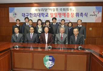 이철우 의원(새누리 경북도당 위원장)이 지난 26일 대구한의대학교 일일 명예총장으로 위촉되어 총장업무를 수행했다. 이철우 의원은 당일 총장 위촉장을 수여받고, 산학협력단 자문위원을 임명하였으며, 대학 각 부처로부터의 업무보고를 받은 뒤, 교수, 직원, 학생 대표들과 학교발전을 위한 간담회를 가졌다. 또한 학교기업 화장품공장을 살펴본 뒤, 학생들의 실습현장을 같이하면서 대학생들과의 대화를 이어갔다.일일 명예총장 위촉과 관련해 변창훈 총장 직무대행은“이철우 의원의 과거 행정가로서(경상북도 정부부지사) 경험과 의정활동 경험이 우리 대학구성원과의 대화를 통해 국가정책을 이해하고, 대학이 나아가야할 방향을 정립하는데 많은 도움이 될 것으로 기대한다”고 밝혔다. 이철우 의원은 각 부처로부터의 업무보고를 통해 대학 현안을 파악하고, 변화하는 환경에서 대학이 나아가야 할 길이 무엇인지에 대해 대학 관계자들과 심도있는 대화를 나눴다. 각 부처별 업무보고 과정에서 이철우 의원은 “지방대학이 어려운 환경 속에서도 대구한의대학교의 특성화 및 구조개혁을 통한 경쟁력 강화 과정에 크게 놀랐다”고 밝히면서, 젊은 총장과 보직자들의 노력을 격려했다. 이어진 간담회를 통해 이철우 의원은 박근혜 정부의 지방대학에 대한 정책기조에 대해 설명하면서, 향후 지방대학이 지역사회와 같이하지 않는다면 대학의 존립이 위태로워질 것이라고 주장하면서, 대학구성원 개개인의 변화를 주문했다.간담회에 참석한 박민규 총학생회장(산림조경학과 4)은“국회의원이 직접 현장을 찾아 정책을 설명하고, 관련 의견을 귀담아 듣는 모습이 매우 이채로웠다. 그리고 본 간담회를 통해 우리 학생들이 가져야할 자세와 도전정신에 대해 다시 한번 생각해볼 수 있는 좋은 기회가 되었다”라고 말했다.이철우 의원은“지역사회와 같이하는 대구한의대학교의 일일 명예총장으로 임명된 것을 감사드린다”면서, “지역사회의 미래를 책임질 젊은 대학생들과의 대화를 통해 젊은이들의 고민을 같이 함으로써, 보다 실효성있는 국가 및 지역정책을 수립하는 토대로 삼고 싶다”고 말했다.대구한의대학교는 앞으로 국가 및 지역의 오피니언 리더들을 대상으로 일일 명예총장제도를 확대 실시하여, 대학 구성원들과의 직·간접적 교류를 활성화함으로써 대학발전을 위한 조직문화를 개선해 나갈 예정이다.강을호 기자